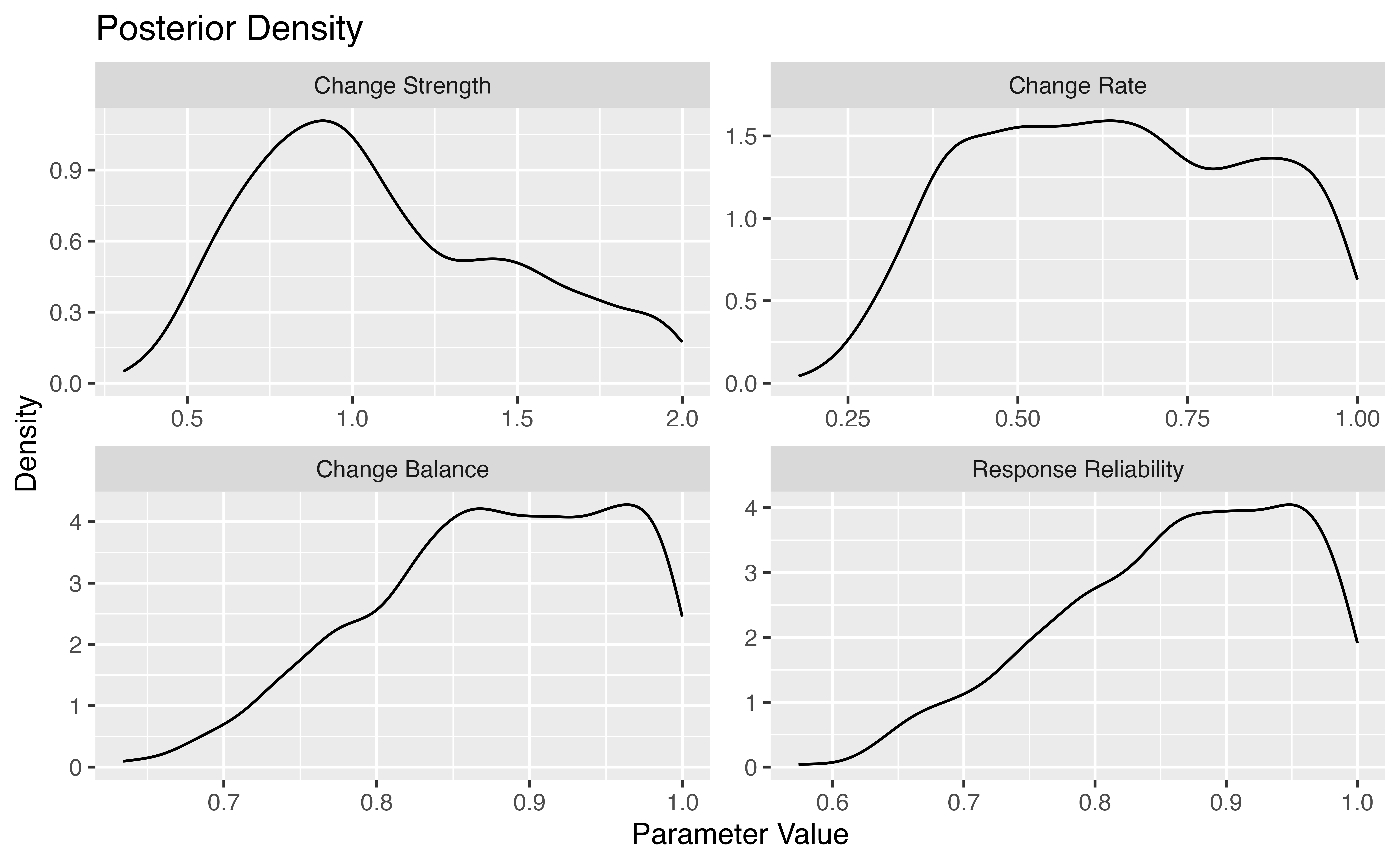 where we have a random variable for true scores, with varying realizations , representing a person ’s beliefs at time ; an indicator for change, , operationalized as a non-reversible trigger if there is a respondent-level change in true scores; an effect size, , and a respondent level direction multiplier that indexes whether the change is positive or negative.